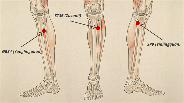 stimulace akupresurních bodů ST36, SP9 a GB34